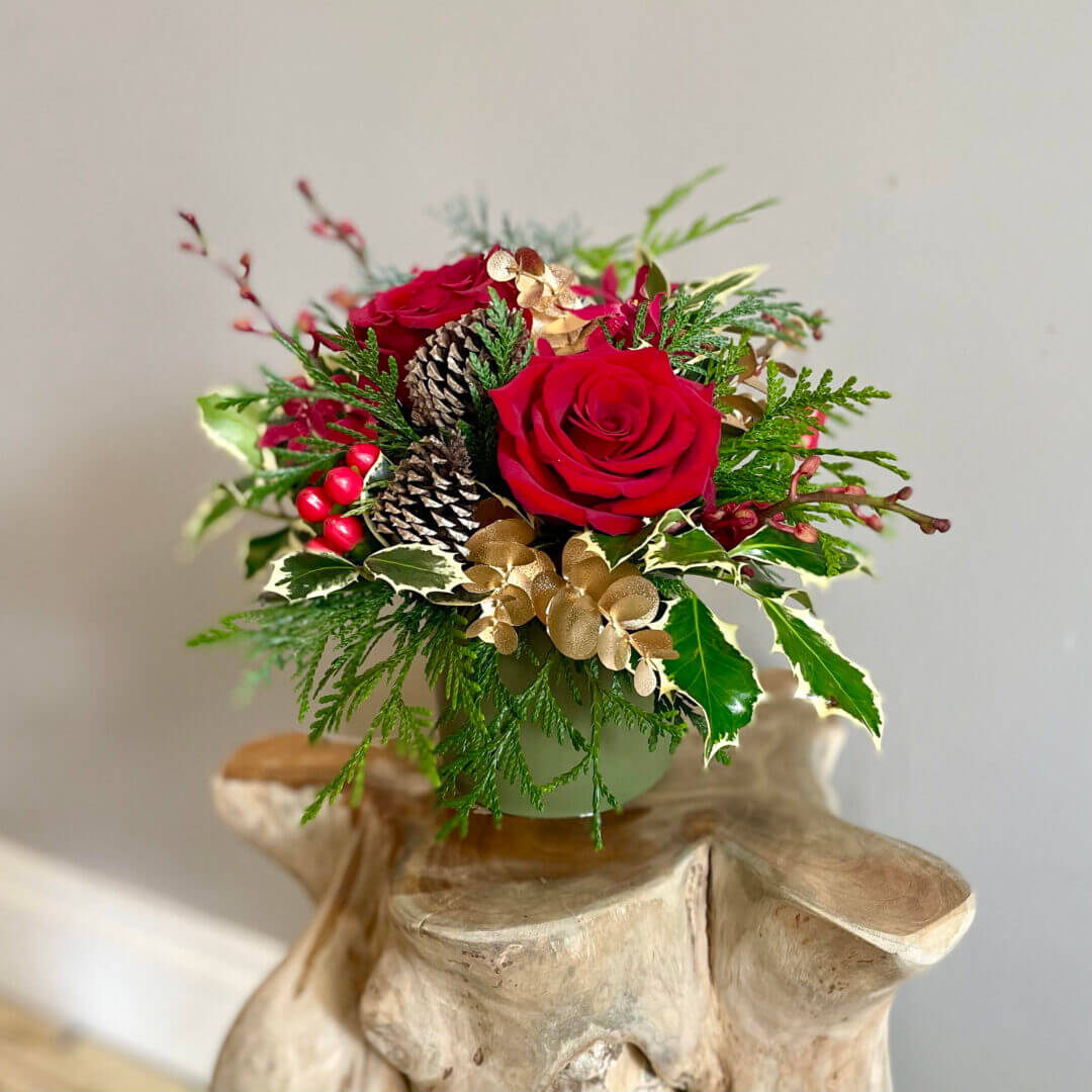 A festive petite pot arrangement incorporating beautiful festive blooms, foliages and botanical tid bits.