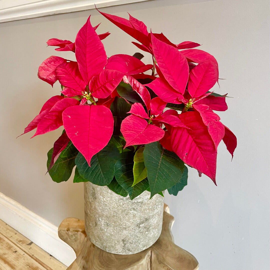 Gorgeous seasonal flowering poinsettia presented in a gorgeous earthy pot.